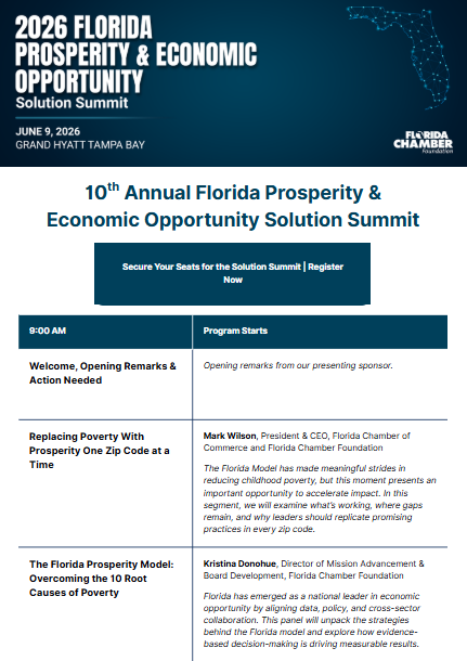 Join us for the Florida Chamber Foundation’s 2026 Florida Prosperity & Economic Opportunity Solution Summit, Tuesday, June 9, 2026, from 9:00am-4:00pm ET, at the Grand Hyatt Tampa Bay. Florida’s business leaders, community advocates, and policymakers will address the 10 root causes of generational poverty, the business impacts of poverty, and ways to get involved at the zip code level to create a pathway to prosperity for all Floridians.